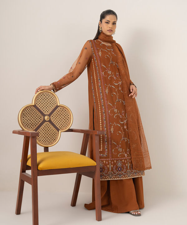 Dyed Embroidered Blended Net Shirt Front Panels 3pc