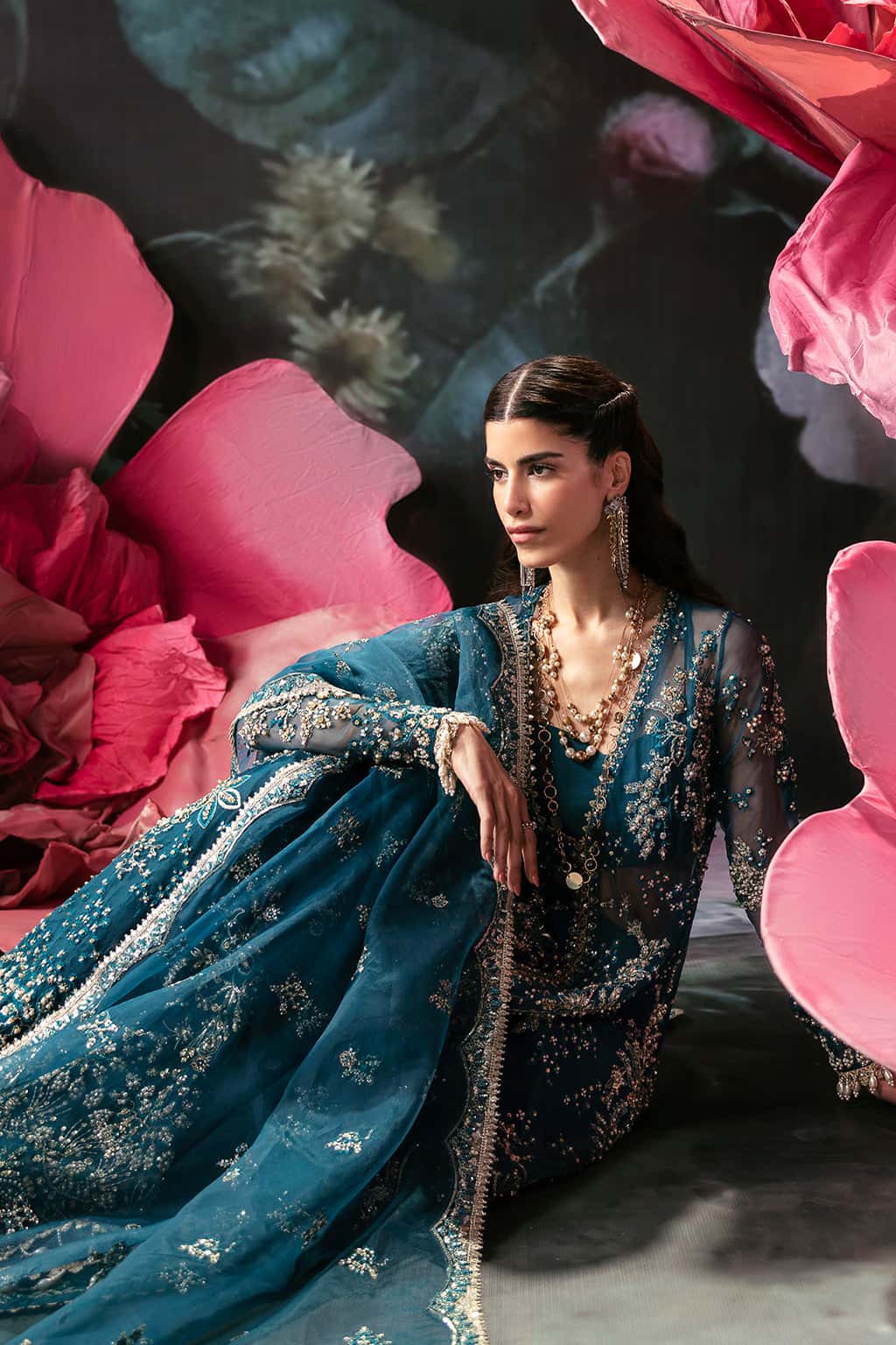 Unit price perDress to impress in this stunning gown crafted from teal organza fabric, featuring intricately embroidered panels hand-embellished with cut dana, pearls, and baithki. The gown boasts full-length fitted sleeves for an elegant touch. It is completed with an embroidered organza dupatta adorned with a sequins border detail, paired elegantly with flared pants.