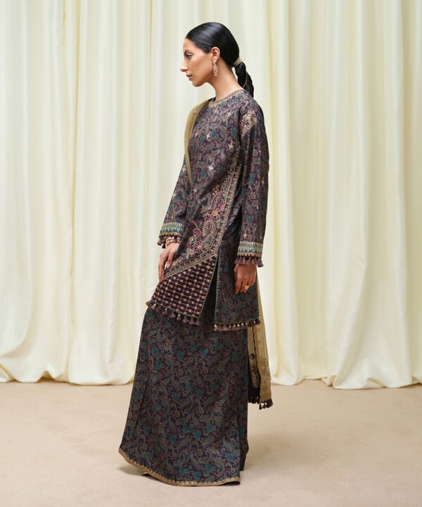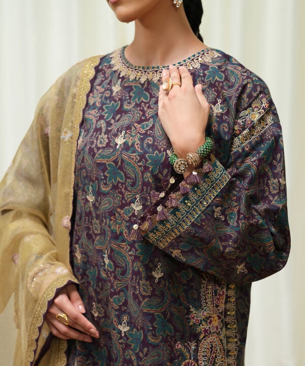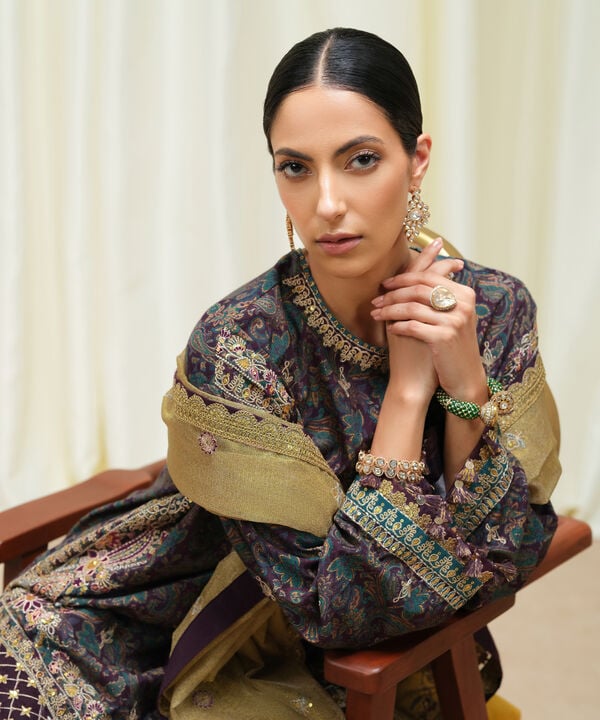 Printed Embroidered Viscose Raw Silk Shirt Front Panels 3pc