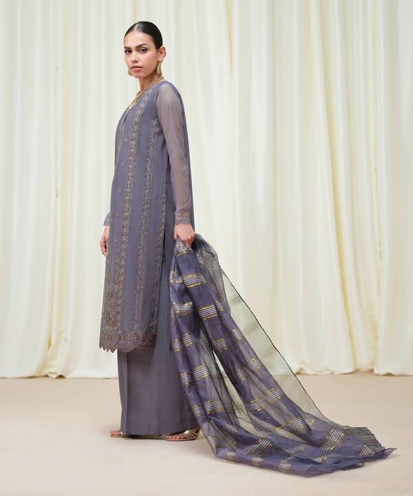 Dyed Embroidered Blended Net Shirt Front Panels 3pc