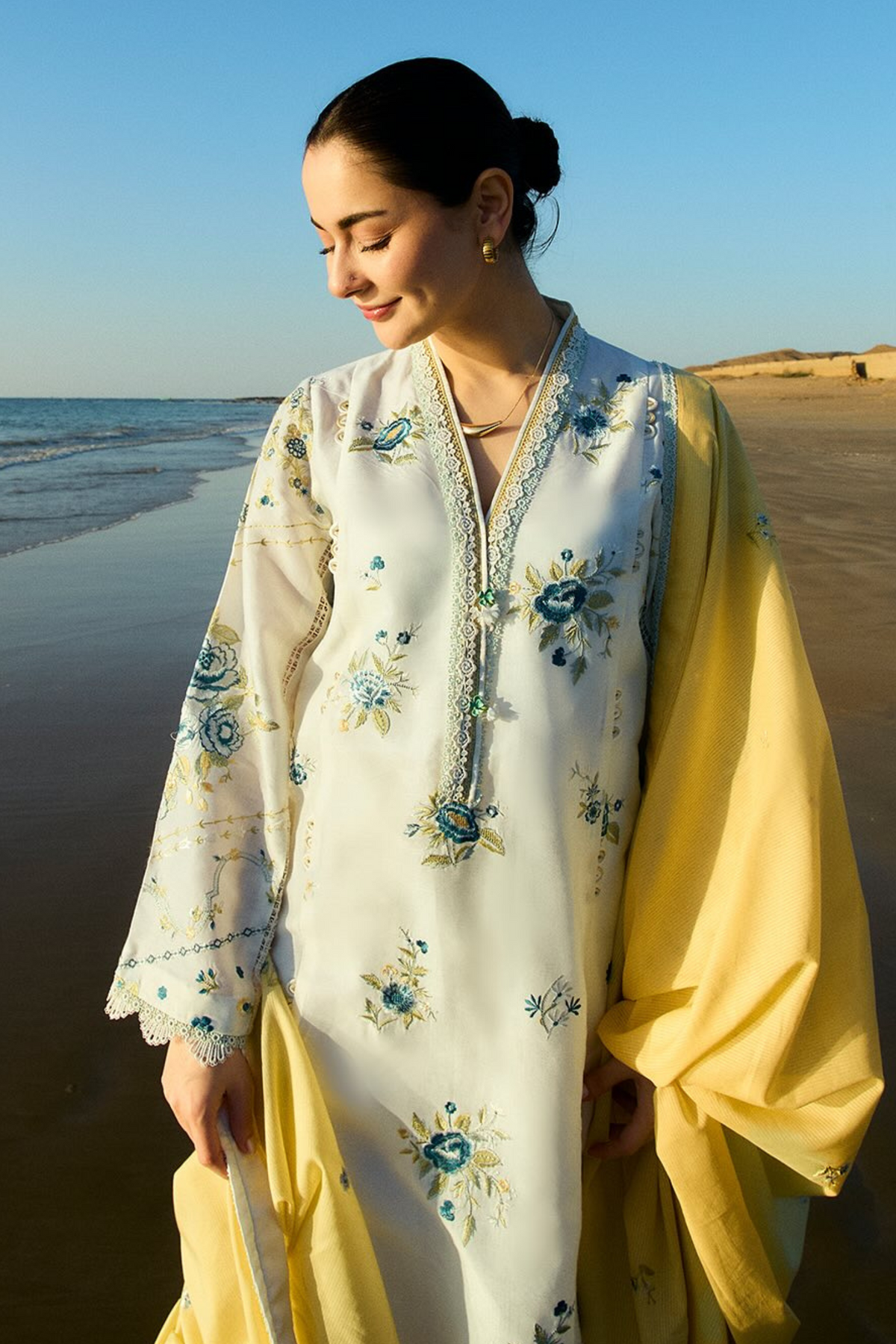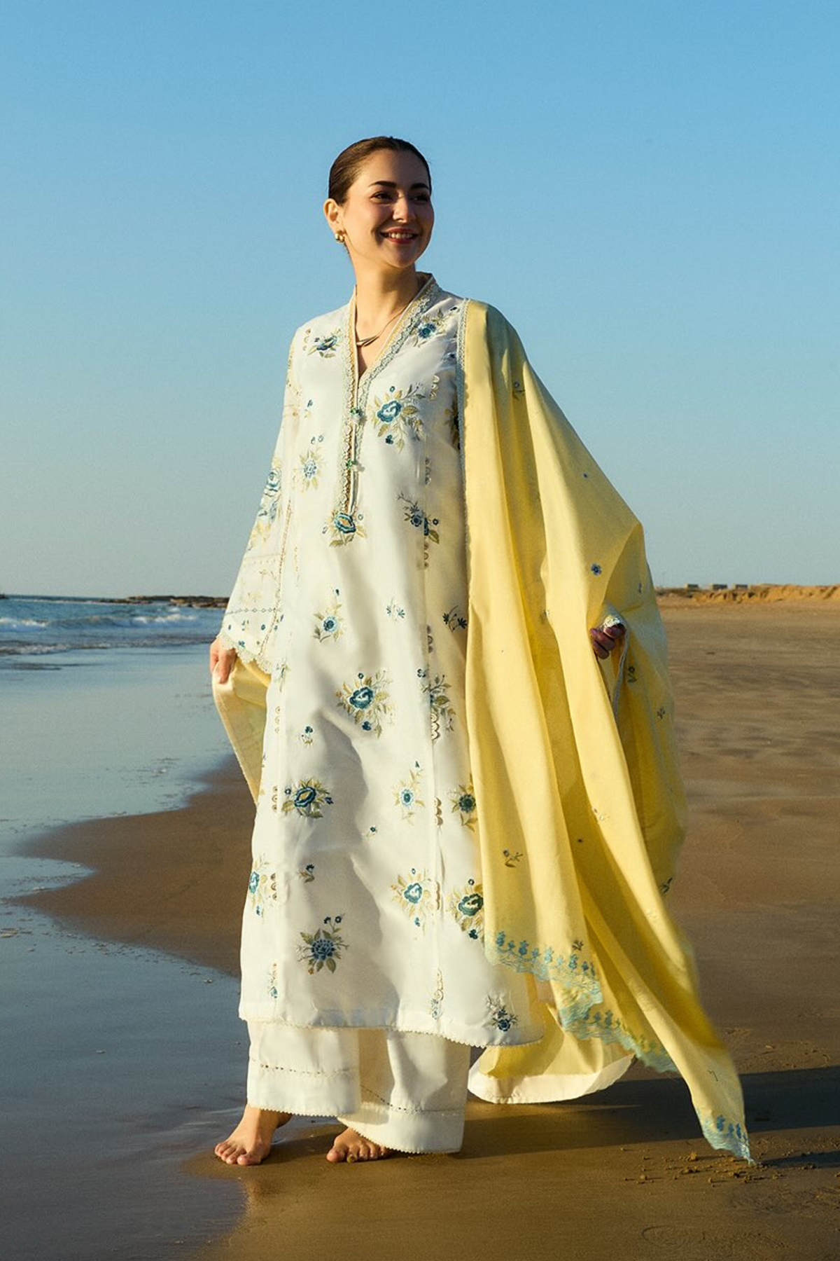 Unit price perA soft vanilla base highlighted by subtle floral embroidery and a sunlit yellow dupatta, creating a captivating appeal.