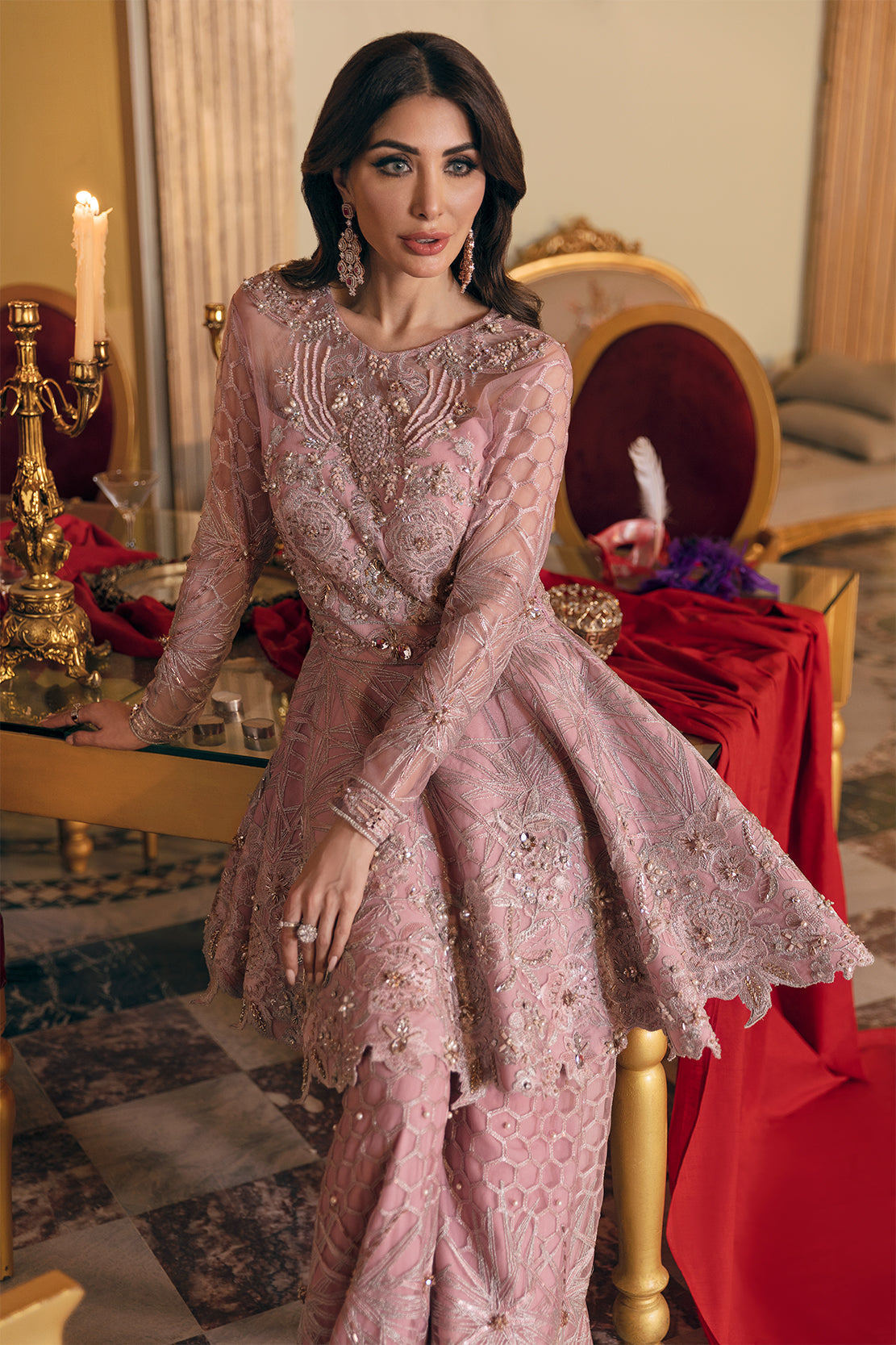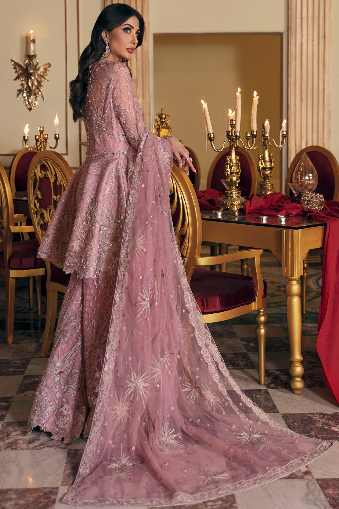 Pink net gown with detailed white embroidery done in various traditional inspired designs. Paired with a flowy net dupatta and a raw silk trouser. The intricate, hand-crafted embroidery uses crystals, pearls, diamondizes and Swarovski crystals.