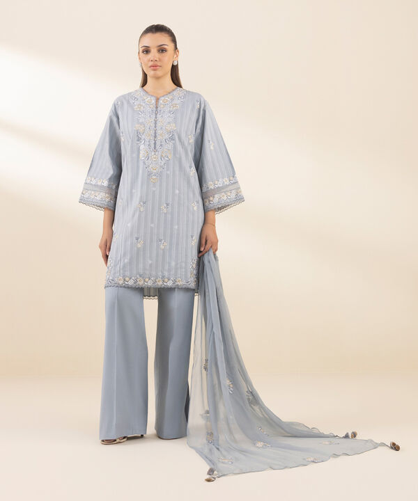 Dyed Embroidered Textured Cotton Shirt Front Panels 3pc