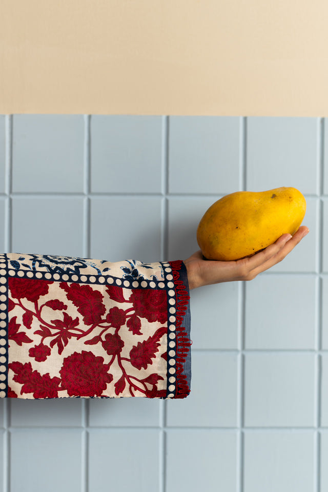 Unit price perA block-printed shirt in earthy tones with off-white trousers, finished with a light chiffon dupatta—grounded, airy, and made for everyday ease.
