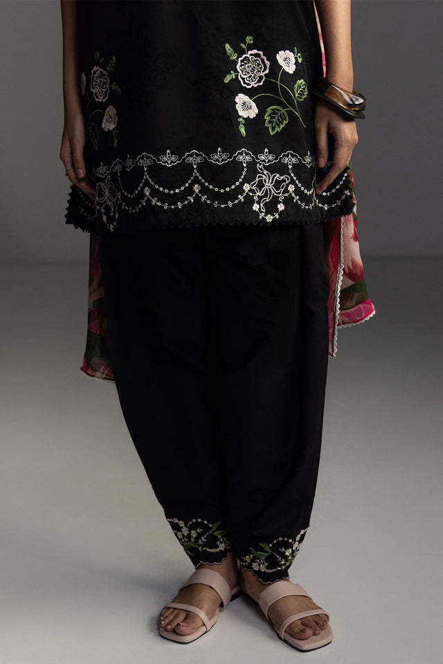 Unit price perAn embroidered black shirt with lace and floral inspired details, paired with a dyed black trouser, and finished with a printed hot pink and maroon dupatta for a bold yet graceful look.