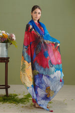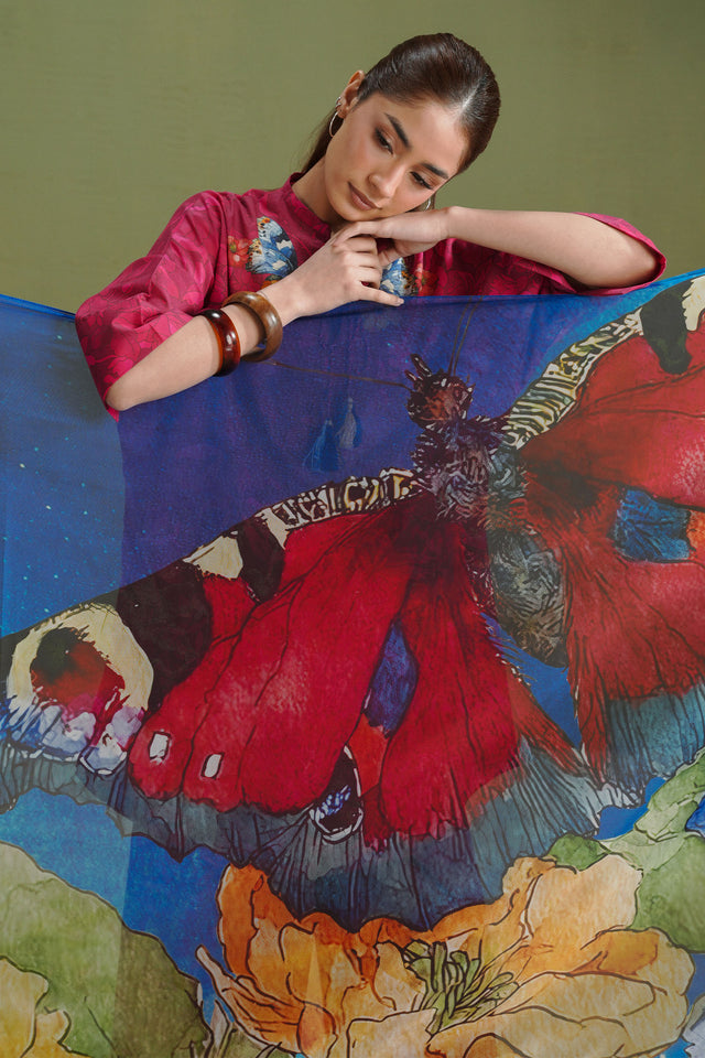 Unit price perThe dupatta showcases watercolor hydrangea florals with butterfly motifs printed in cobalt blue. The shirt and trouser feature coordinated self-floral prints on a cherry red base.