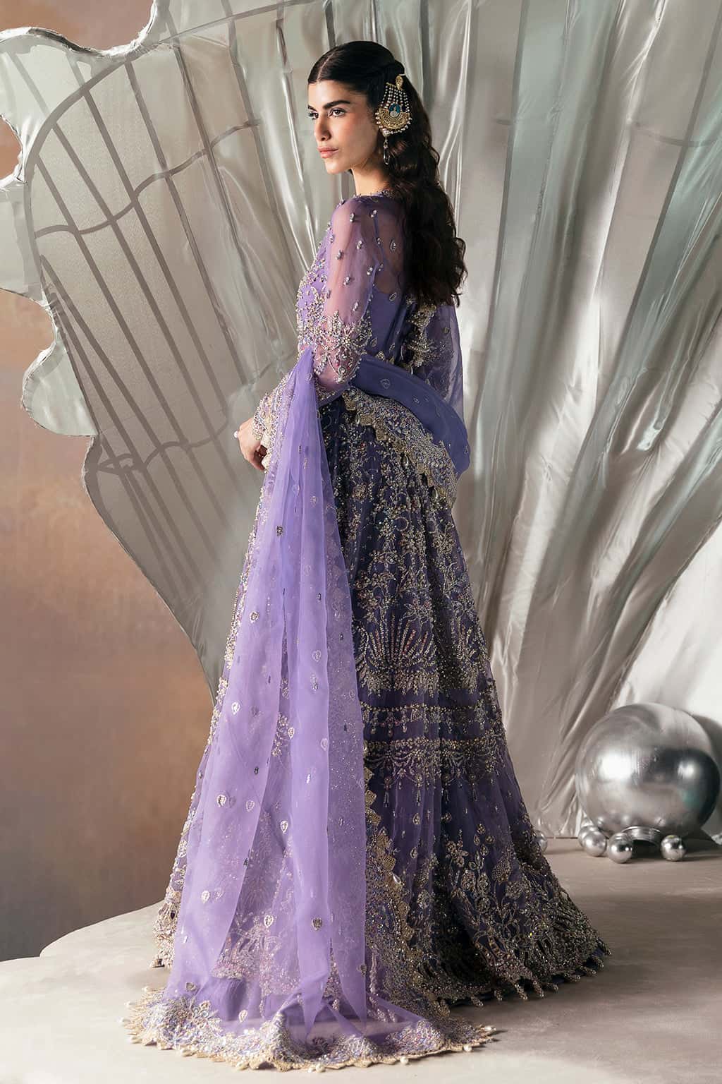 Unit price perEloah immortalises feminine grace with an effortlessly sophisticated aura with its stunning Lilac colour canvas. Crafted from soft organza, this peshwas features floral embroidered panels adorned with dull gold tilla, cutdana, pearls, and sequins hand-worked neatly onto it. Paired with a heavily embellished organza dupatta, this outfit refreshes your wardrobe with perfect pastels.
