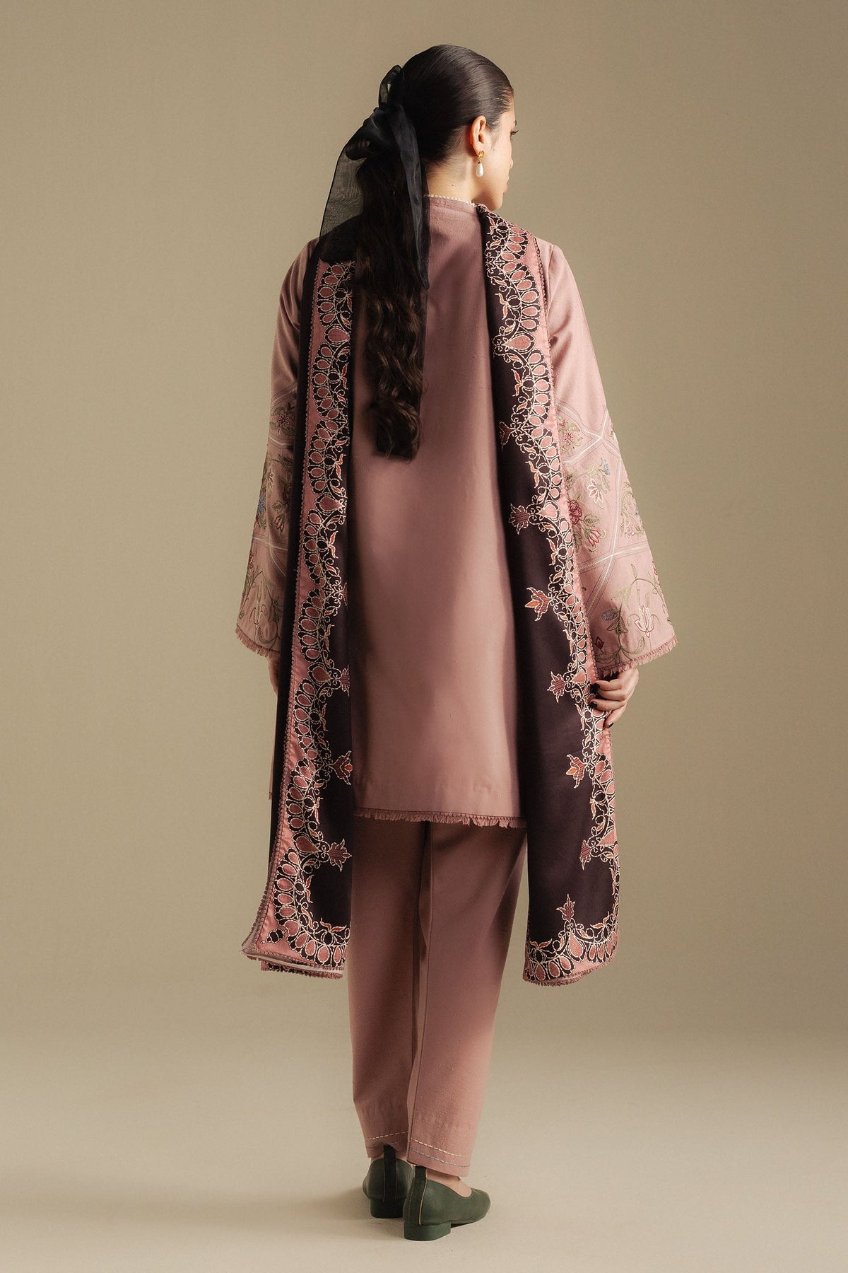 Unit price perA blush pink karandi shirt and trouser paired with a deep brown and candle light peach shawl, a warm yet delicate mix that carries effortless winter charm.